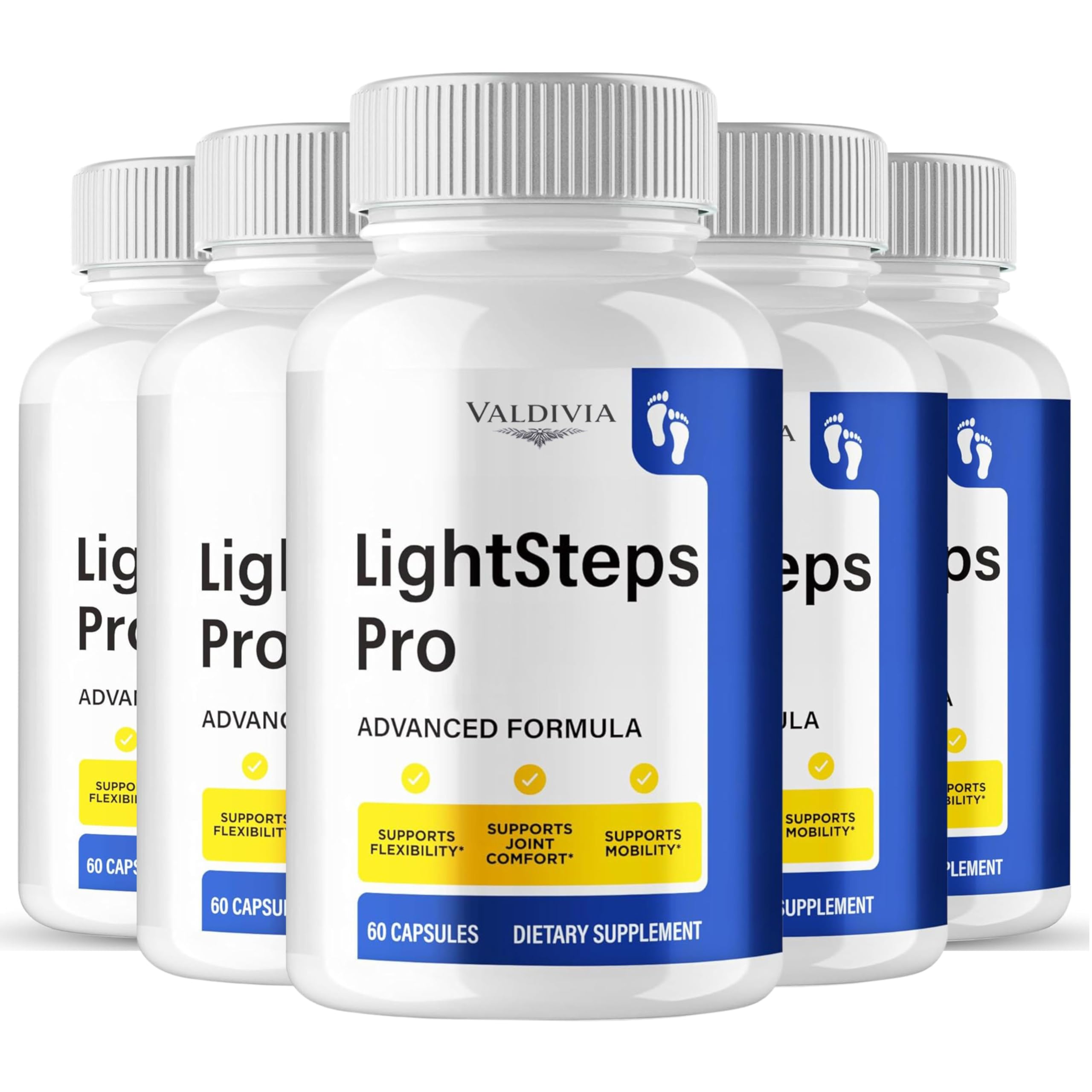 (5 Pack) LightSteps Pro Capsules, Official LightSteps Pro Supplement - Maximum Strength, All Natural Formula Fortify Bones, Movement & Bolster Flexibility, LightStepsPro Support Reviews - 300 Capsules is a premium capsules designed to support joint comfort, mobility, and flexibility. Crafted with carefully selected natural ingredients, this advanced formula delivers targeted nutritional support you can trust. This 5-month supply offers our best value, ensuring uninterrupted support for your wellness journey. Every Valdivia product is manufactured in GMP-certified facilities in the USA and third-party tested for potency, purity, and safety.